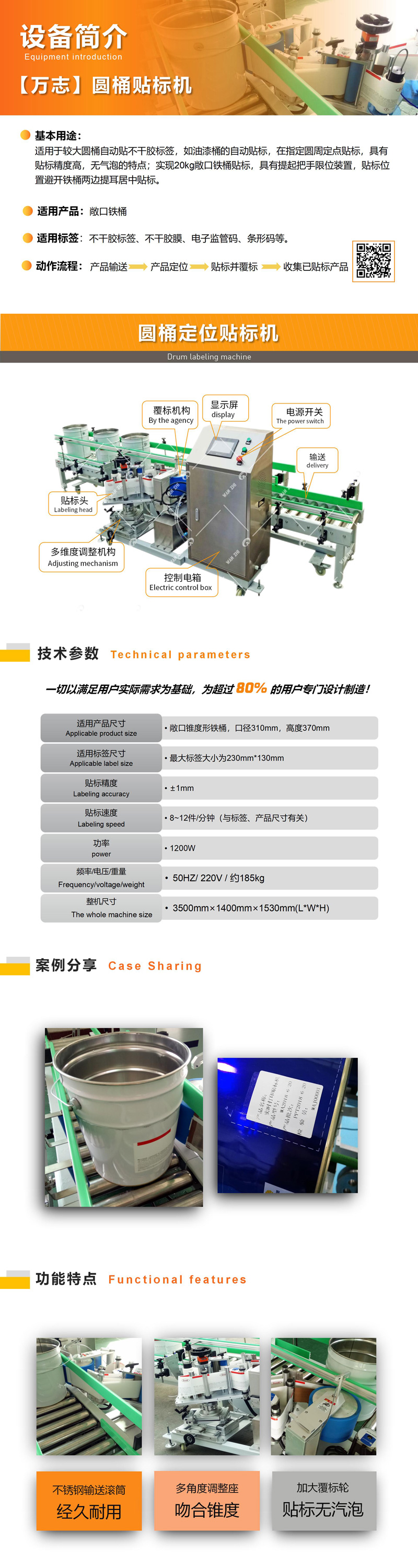 全自動油漆桶貼標機適用于油漆桶的自動貼標,圓周定點貼標,具有貼標精度高,無氣泡的特點;實現20kg敞口鐵桶貼標,可實現定位貼標,具有提起把手限位裝置,貼標位置避開鐵桶兩邊提耳居中貼標。