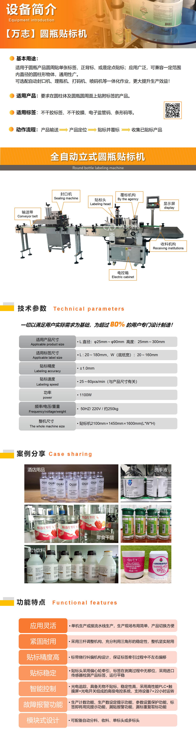 全自動(dòng)圓瓶貼標(biāo)機(jī)適用于在圓瓶類物體圓周面貼標(biāo)簽,可貼單標(biāo)和雙標(biāo),正背雙標(biāo)間距可靈活調(diào)整,如zheli喱水圓瓶、食品圓罐等貼標(biāo),廣泛應(yīng)用于化妝品、食品、醫(yī)藥、消毒水等行業(yè)。選配圓周定位檢測裝置,可實(shí)現(xiàn)在圓周面指定位置貼標(biāo)。可根據(jù)需求選配色帶打碼機(jī)、噴碼機(jī)和封口機(jī)等;