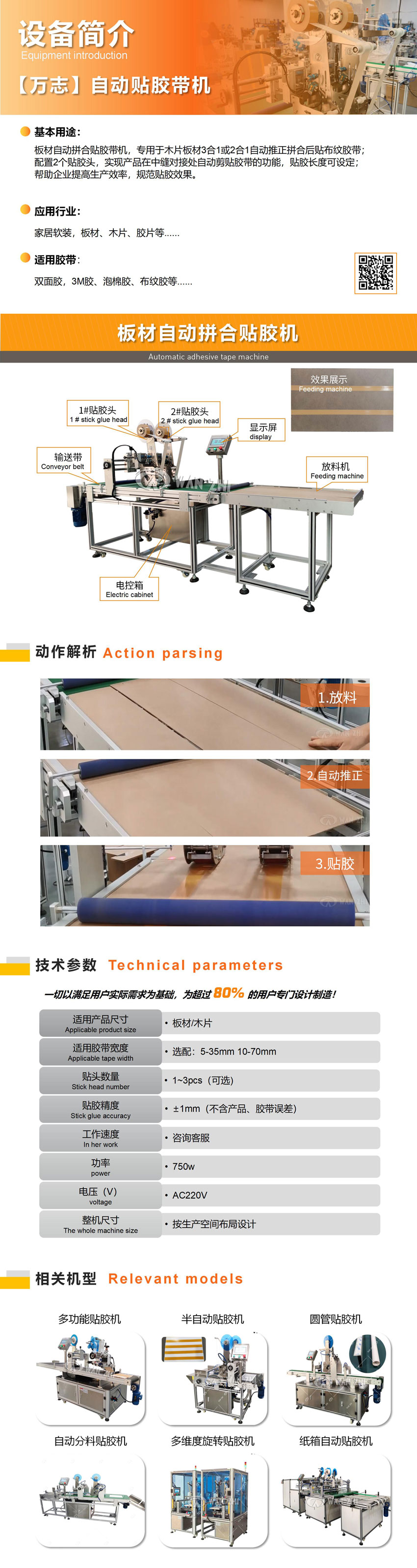 木片自動拼合貼膠帶機專用于木片3合1自動拼合貼雙面膠帶;配置2個貼膠頭,實現產品在2個中縫自動剪貼膠帶的功能,長度可選;提高生產效率,規范貼膠效果。